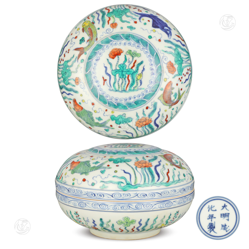• 大明成化年制款斗彩鱼藻纹捧盒