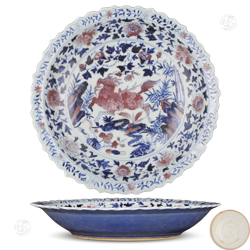 • 青花釉里红瑞兽花口盘